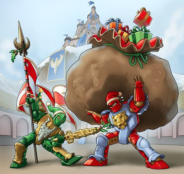 Ben mentioned that it'd be neat to see the development process for one of the Knights pictures, so I drew up this quick Christmas-card frame to use as an example. If this were an actual image for LEGO, the dimensions would be several times larger in order to have the proper resolution for printing, and the image would go through a series of approvals by several departments to make sure that it creates no legal or cultural problems, that it fits in with the story and marketing direction for the Knights products, and that it doesn't create certain other types of conflicts with other LEGO product lines.